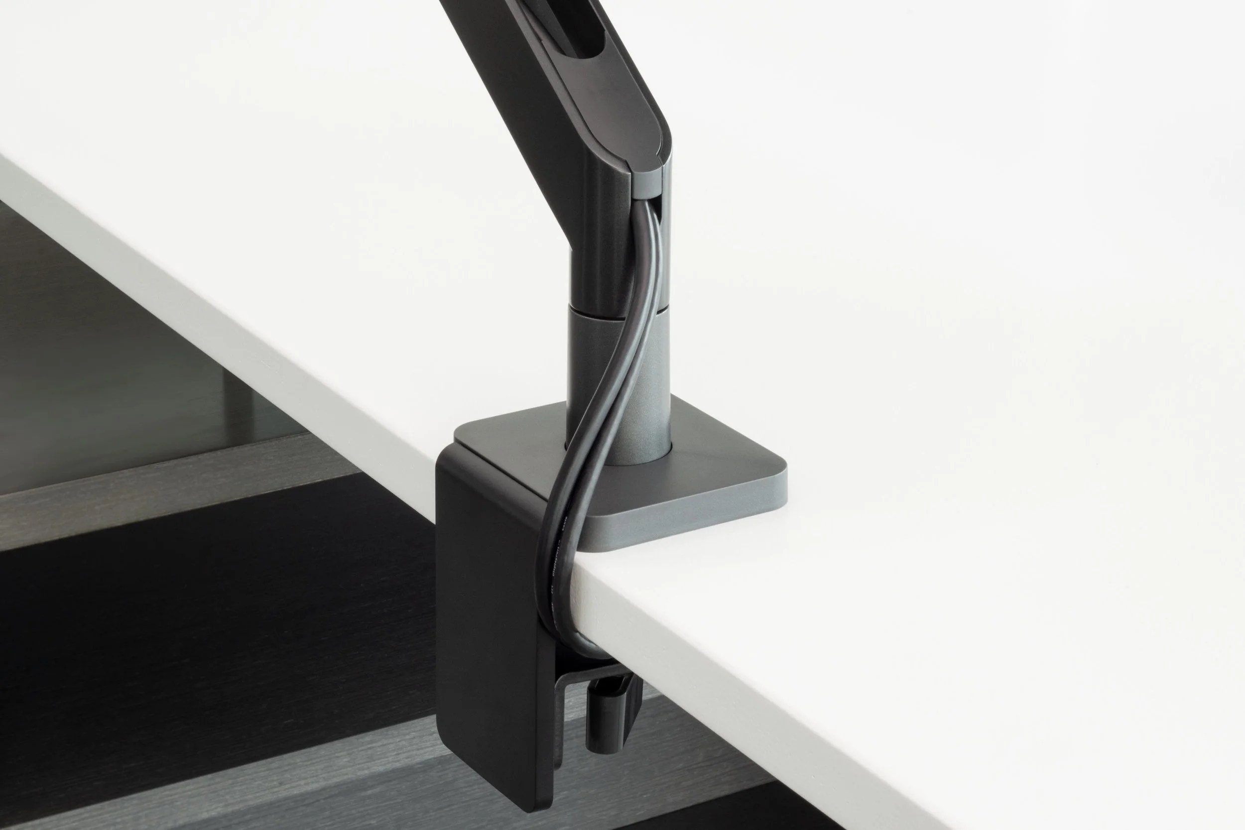 Thoughtful wire management is integrated into the hollow lower reach arm, allowing Swerv to be quickly adjusted to new positions without interference. Cables are managed from the screen to under the worksurface, letting users concentrate on the task at hand and not cable clutter.