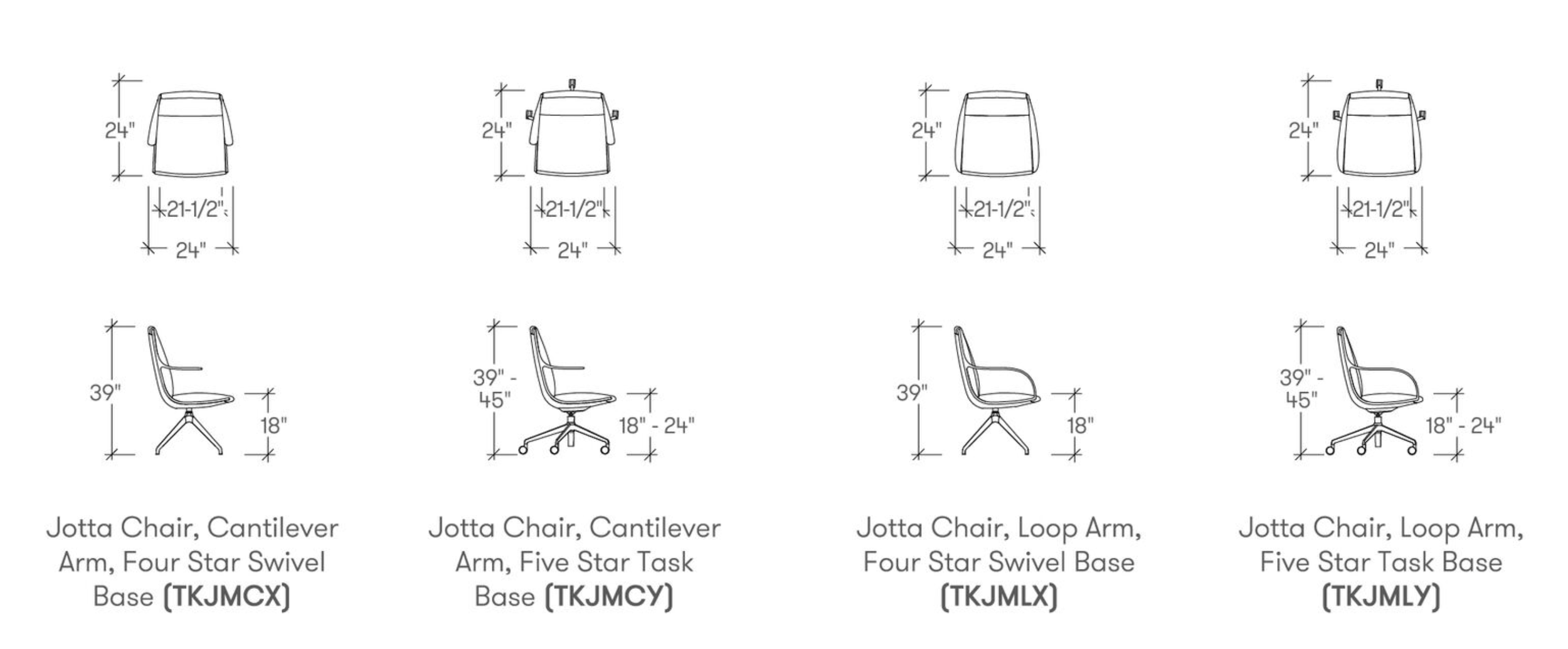 The versatile design of Jotta makes it a practical choice for various work positions, ensuring comfort and providing support. Jotta is available in a cantilevered or looped aluminum arm with a fully upholstered seat. Paired with a Four Star Swivel base on glides or adjustable Five Star Task base on casters, Jotta may be finished in any of Studio TK's Fundamental or Fashion metal finishes.